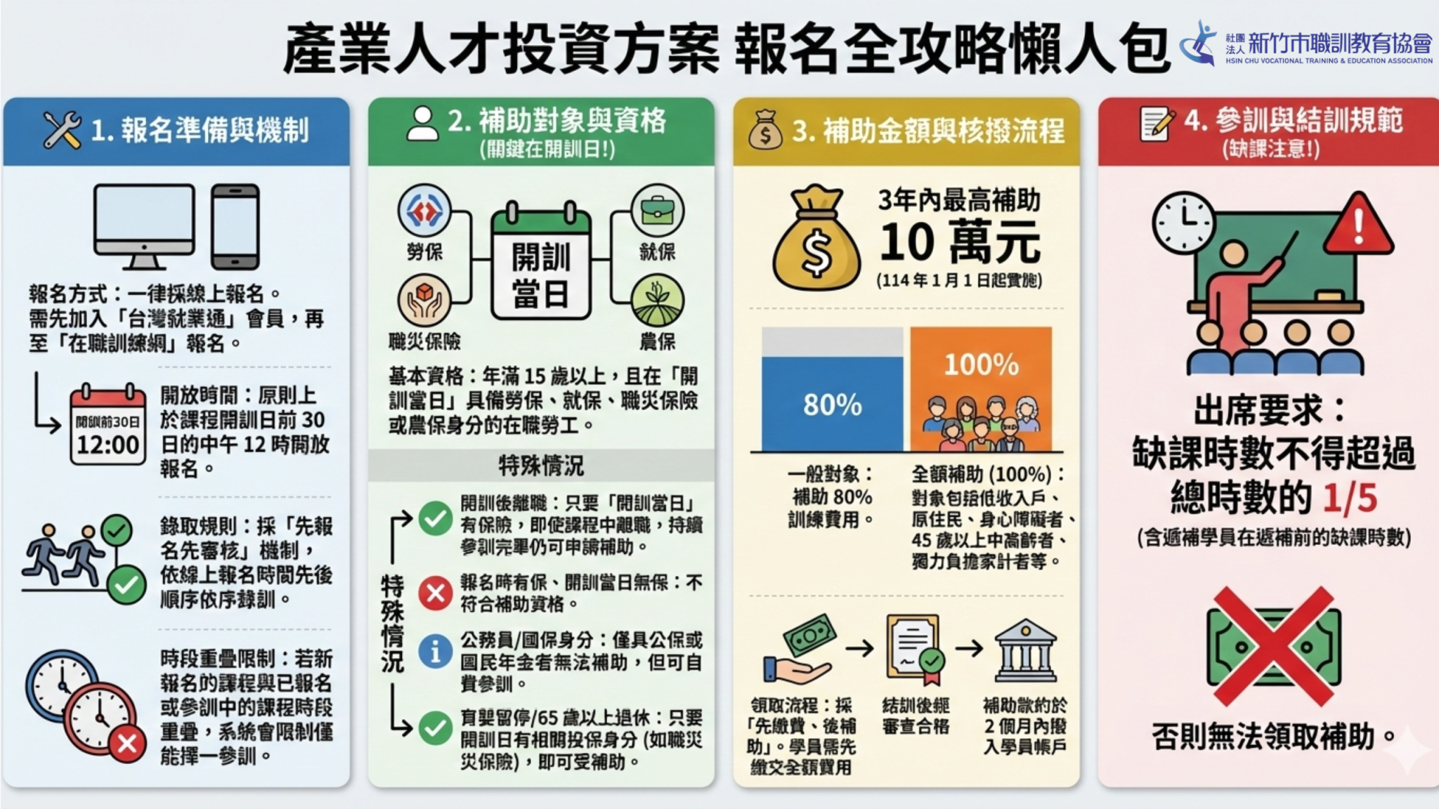 - 出席要求: 缺課時數不得超過總時數的 1/5(含遞補學員在遞補前的缺課時數),否則無法領取補助。