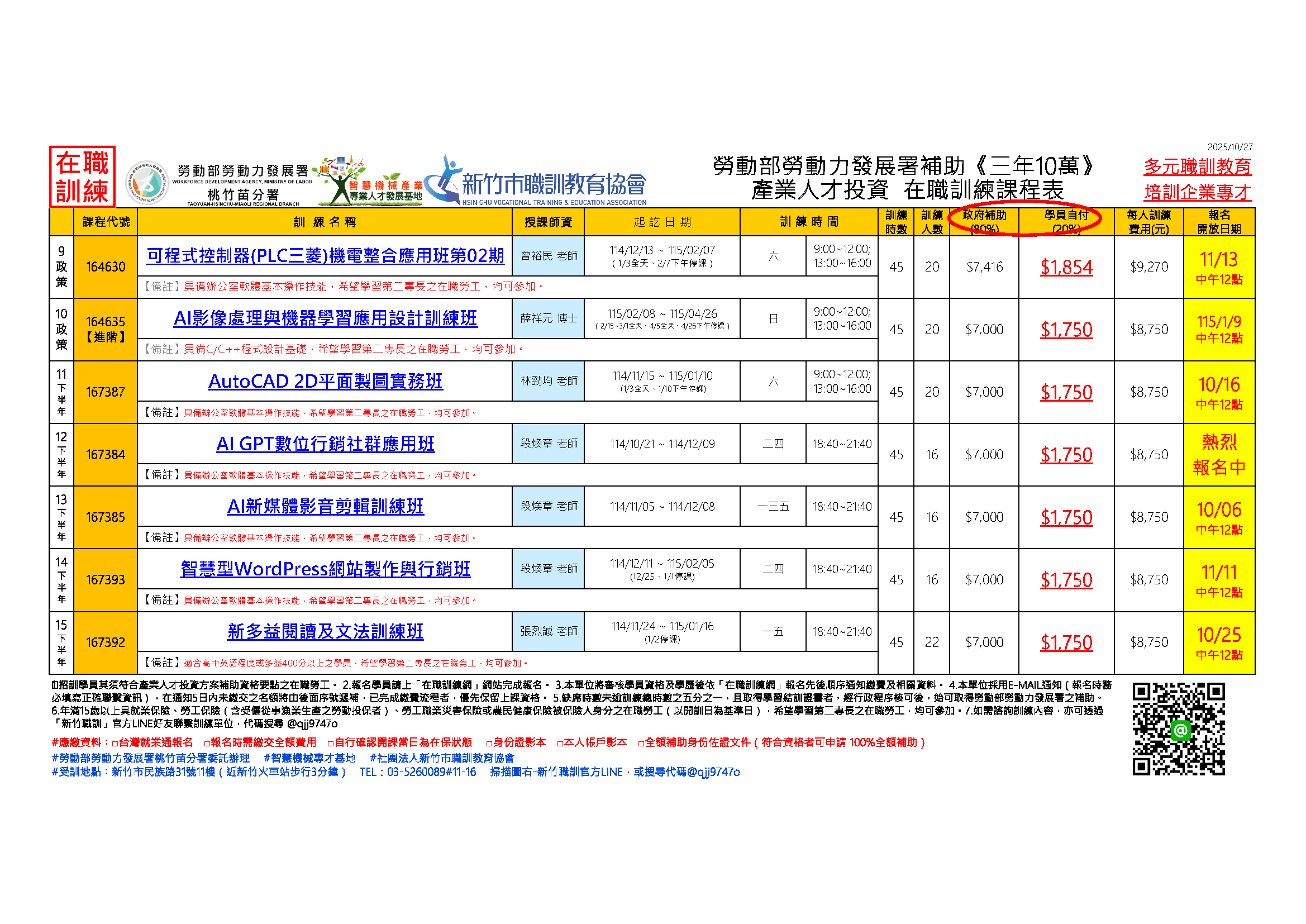 為了鼓勵大家在工作之餘可以依照自己的興趣或是專業領域來進修,不但可以提升職場競爭能力也能培養第二專長技能,透過勞動部推廣的「產業人才投資方案」,只要完成課程時數就能獲得80%-100%的學費補助,3年10萬,課程內容豐富多元、歡迎各行各業民眾報名。